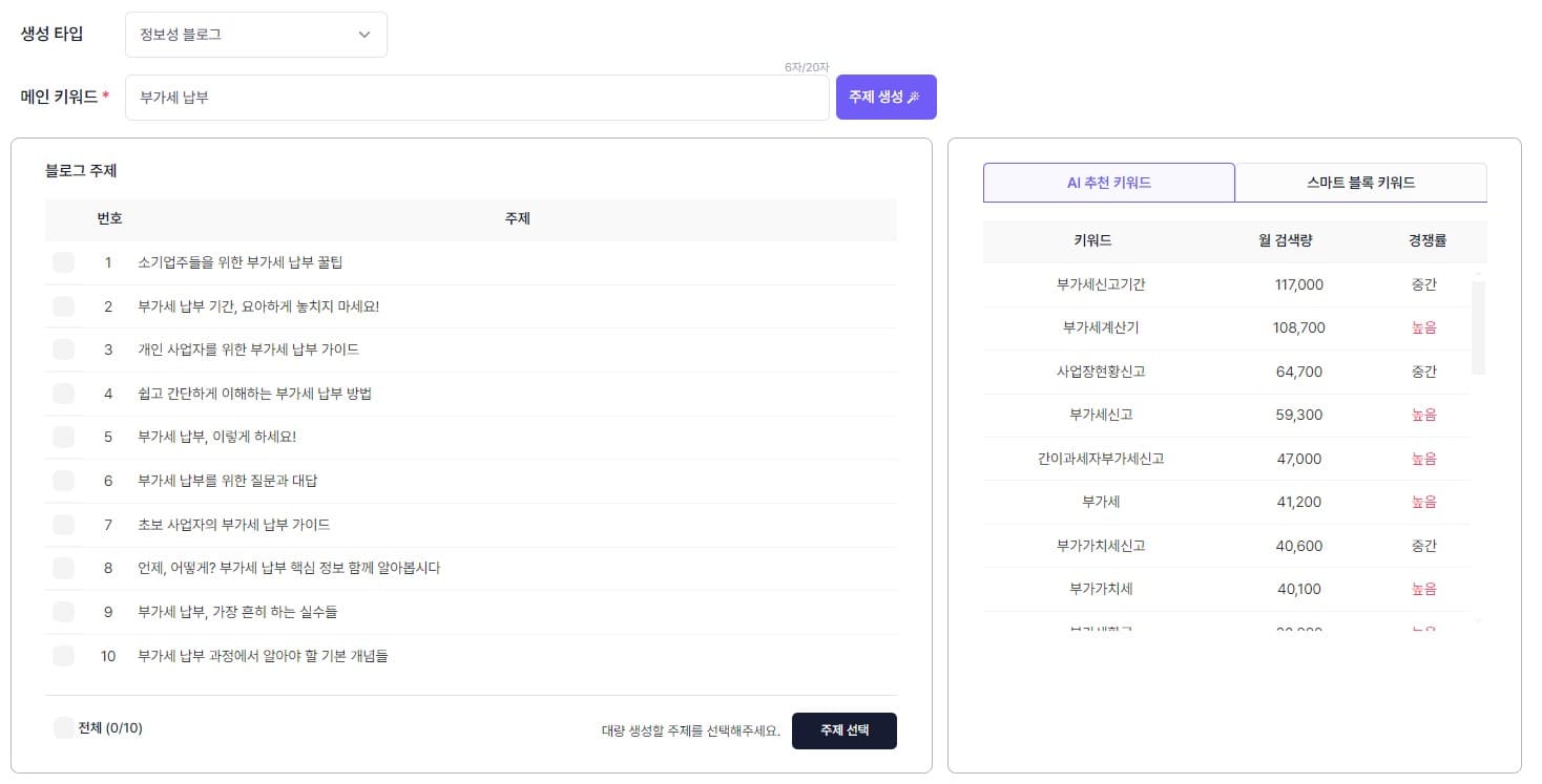 일단 첫 번째로 놀란 점은 대량 키워드 메뉴에서 활용할 수 있는 주제 제안 기능이에요. 예를 들어, '부가세 납부'라는 주제로 글을 작성하고자 할 때, 가제트AI는 관련된 세부 주제와 키워드를 자동으로 제안해주더라구요. 아래 사진처럼요.