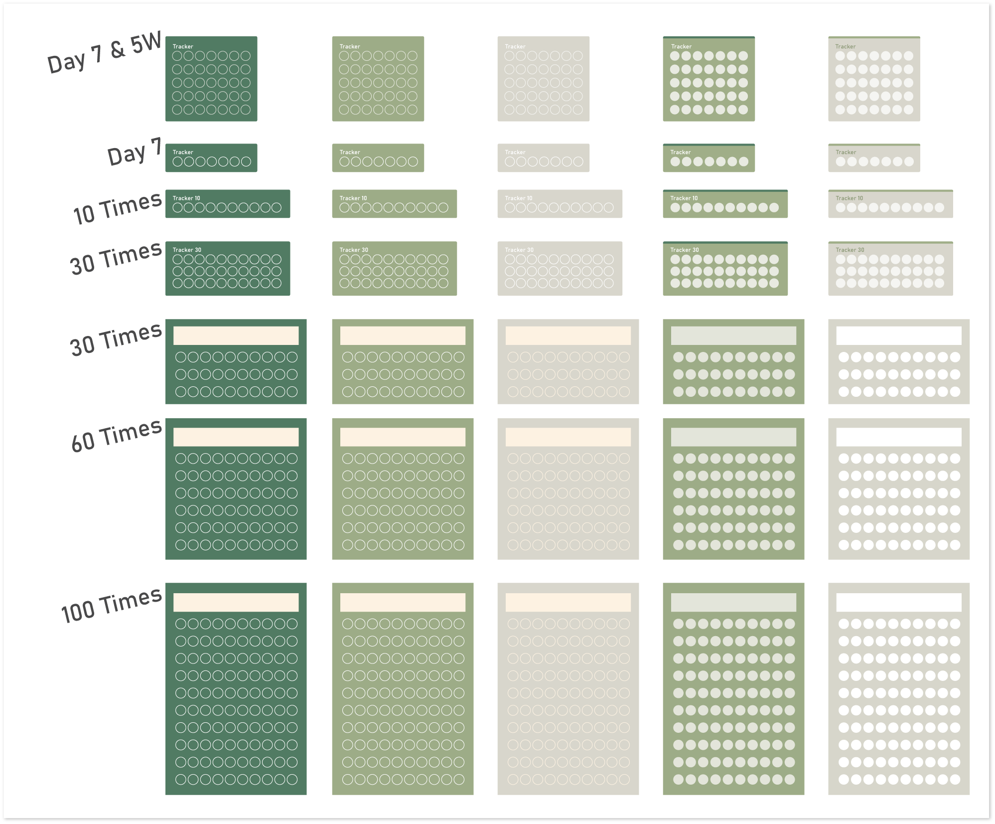스티커는 최소 7회(7일)부터 100회(100일)까지 계속 체크하며 봐야하기 때문에 최대한 눈에 거슬리지 않고, 질리지 않으면서도 눈이 편안한 색이어야한다고 생각했어요.