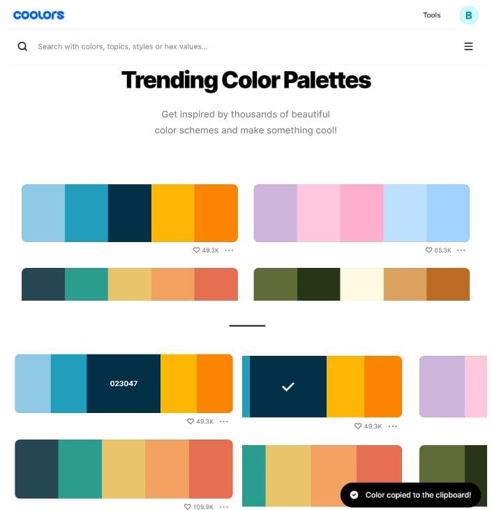 'Explore Palettes'에서는 인기있는 색상 팔레트들을 한 눈에 확인할 수 있어요. 제가 무료로 Coolors를 이용할 때 가장 많이 사용했던 기능이죠. 이 페이지를 즐겨찾기해두고 필요할 때마다 와서 원하는 색상 칸만 클릭하고 바로 다음 작업을 이어갔었어요. 클릭만 하면 바로 클립보드로 복사되니까 너무 편했습니다. 지금도 자주 사용하는 기능!