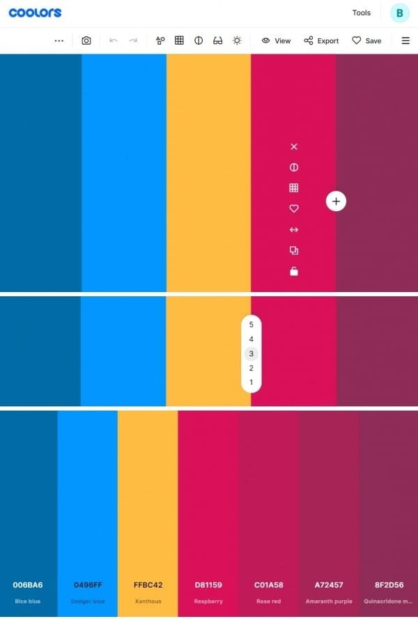 Palette Generator에서는 색상 사이에 마우스를 가져다대면 + 버튼이 생기는데요. 이 버튼을 꾹 누르면 1부터 5까지의 숫자가 나옵니다. 이 숫자를 선택하면 양 옆의 색상 사이의 색상 N가지를 자동으로 추가해줍니다.