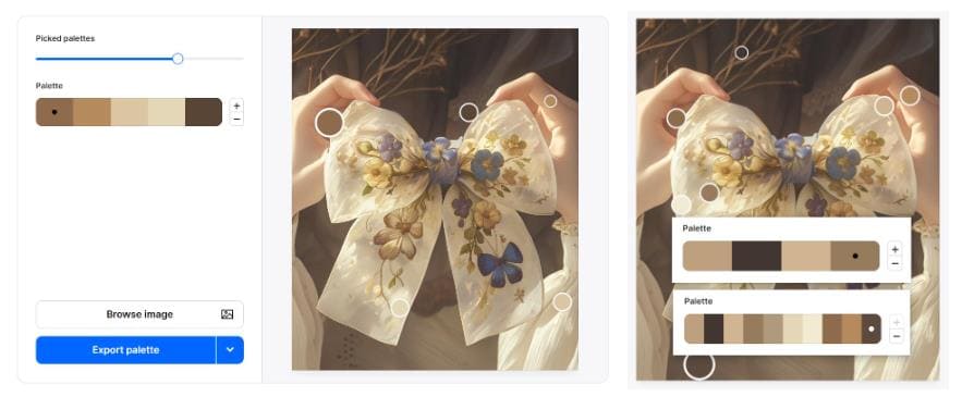 제가 Coolors에서 최근에 가장 많이 사용하는 기능 중 하나가 이미지로 컬러 팔레트를 만드는 기능이에요. 영어 이름으로는 'Image Picker'입니다. 이미지를 사용해서 팔레트 색상 구성을 2컬러부터 10컬러까지 만들 수 있어요. 이미지에 있는 색상을 사용해서 컬러를 추출하는 작업이라서 색감이 마음에 드는 그림이 있다면 이미지 픽커로 컬러팔레트를 생성해도 좋아요.