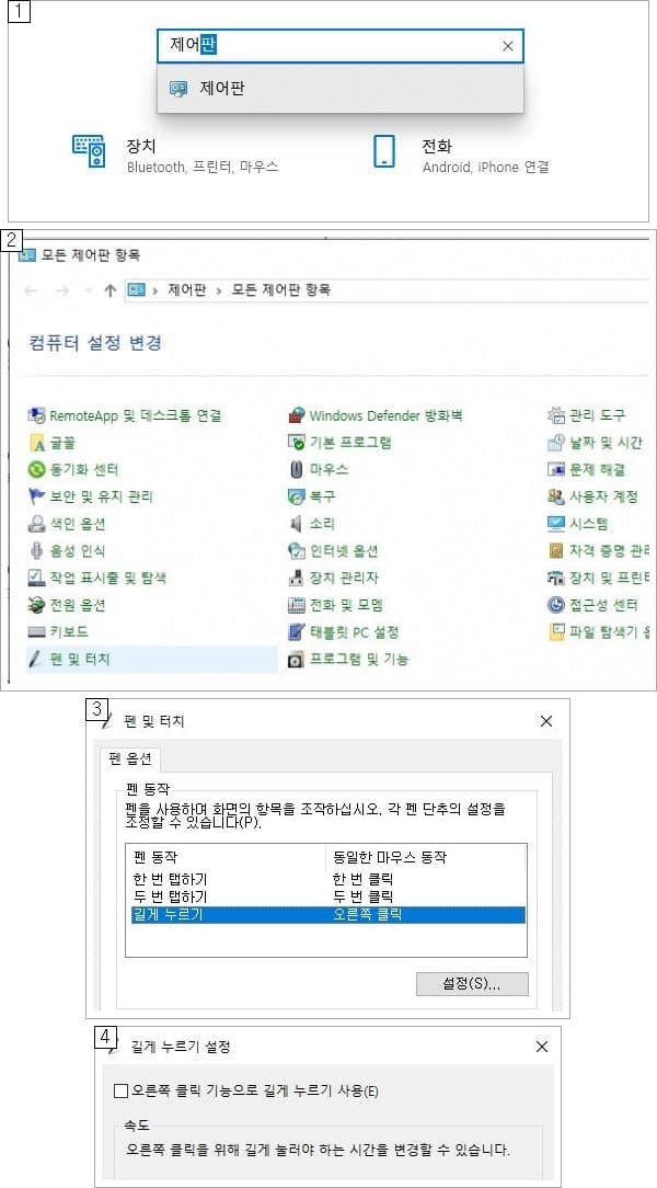 펜 및 터치를 누르고 펜 옵션에서 펜 동작 길게 누르기를 선택한 후 설정을 누릅니다. 길게 누르기 설정 맨 위의 [오른쪽 클릭 기능으로 길게 누르기 사용]을 꺼줍니다. 체크박스 체크 해제! 확인 버튼까지.