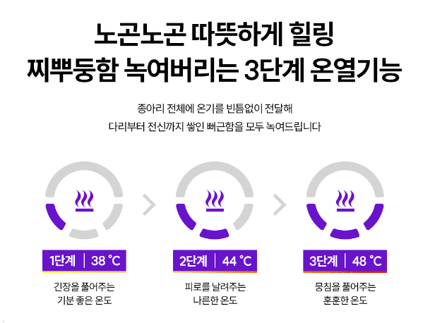 온열 기능도 있어서, 겨울철이나 다리가 차가워질 때 사용하면 따뜻하게 마사지 받을 수 있어서 좋더라구요. 강도는 3단계로 조절할 수 있어서, 자신의 취향에 맞게 설정할 수 있어요.