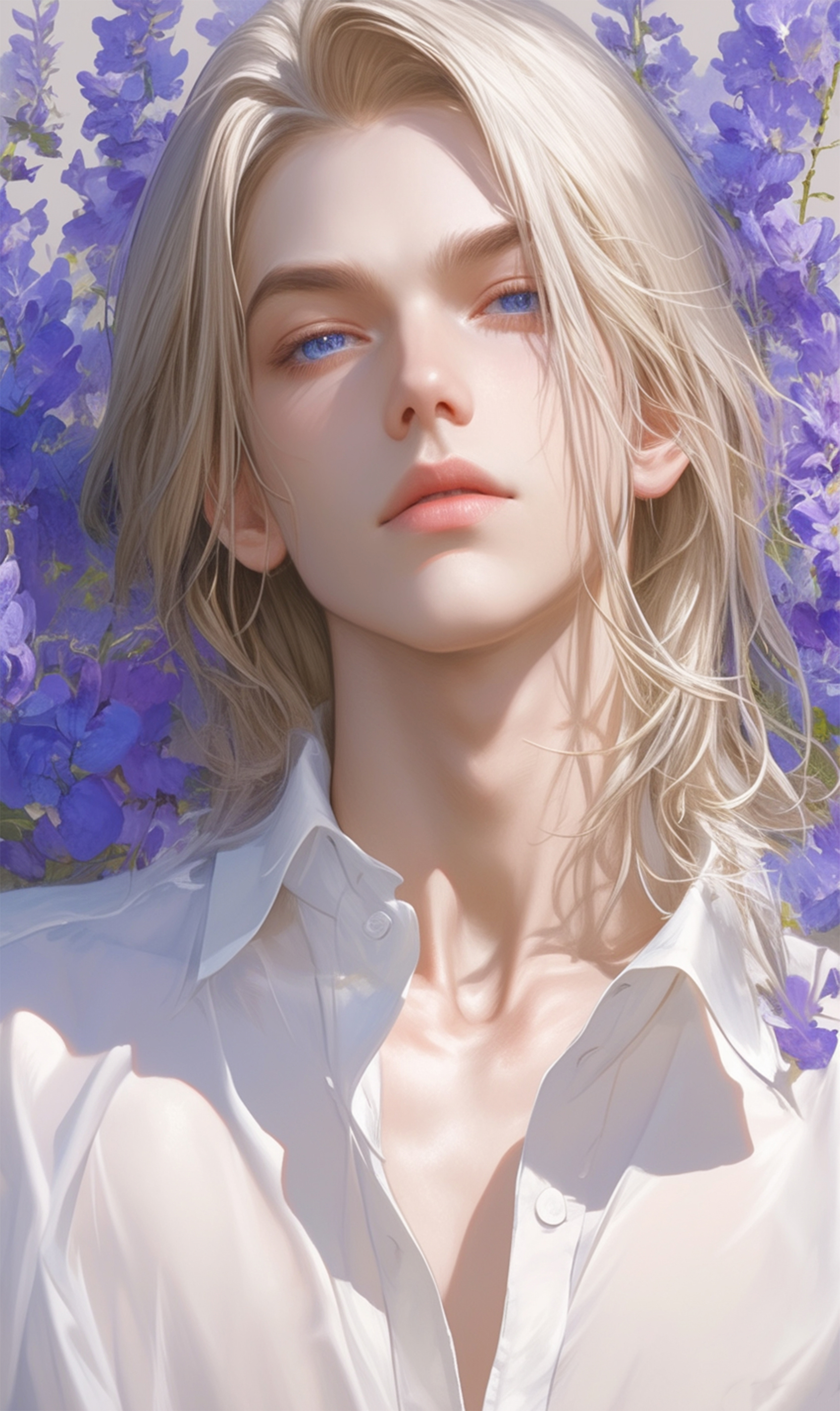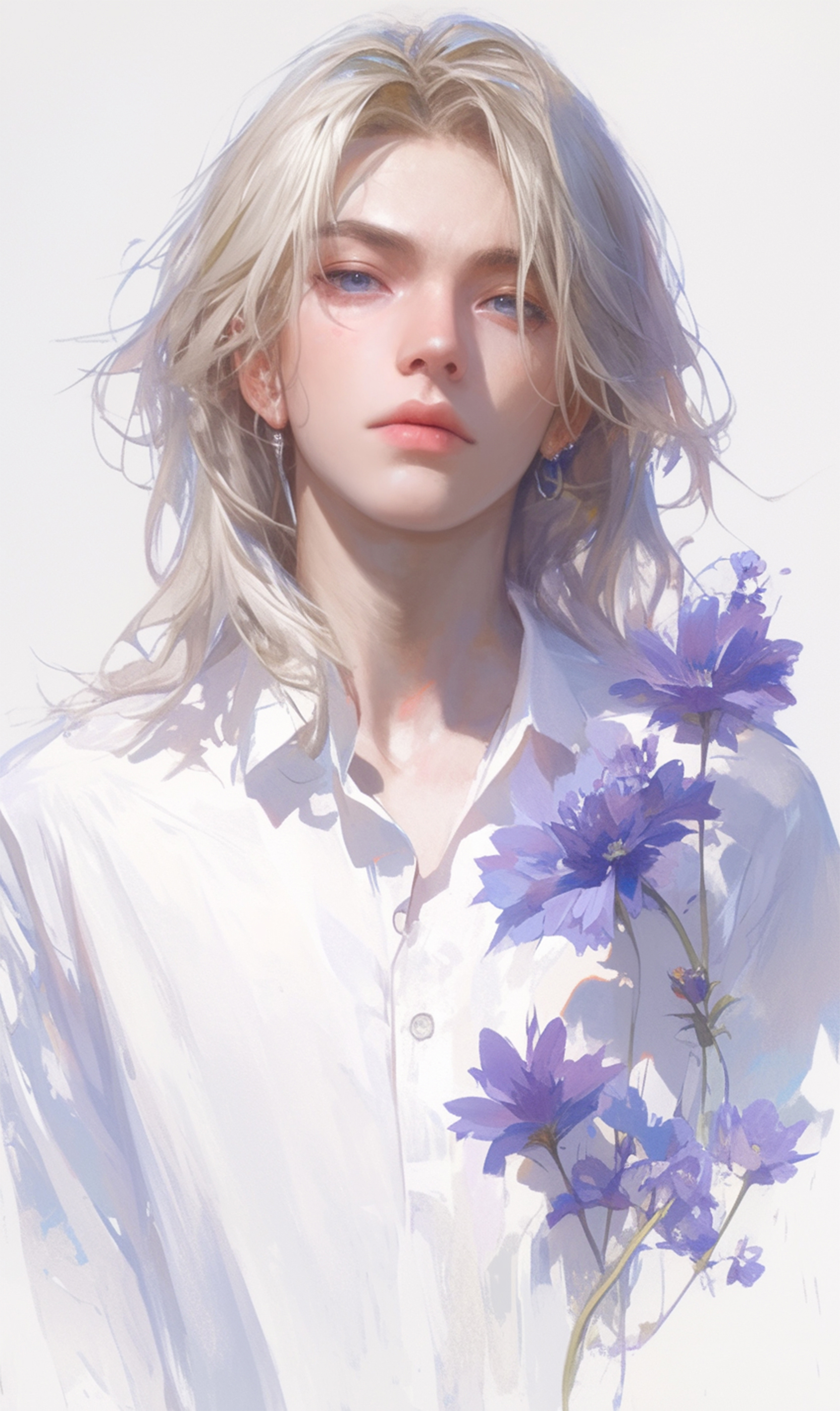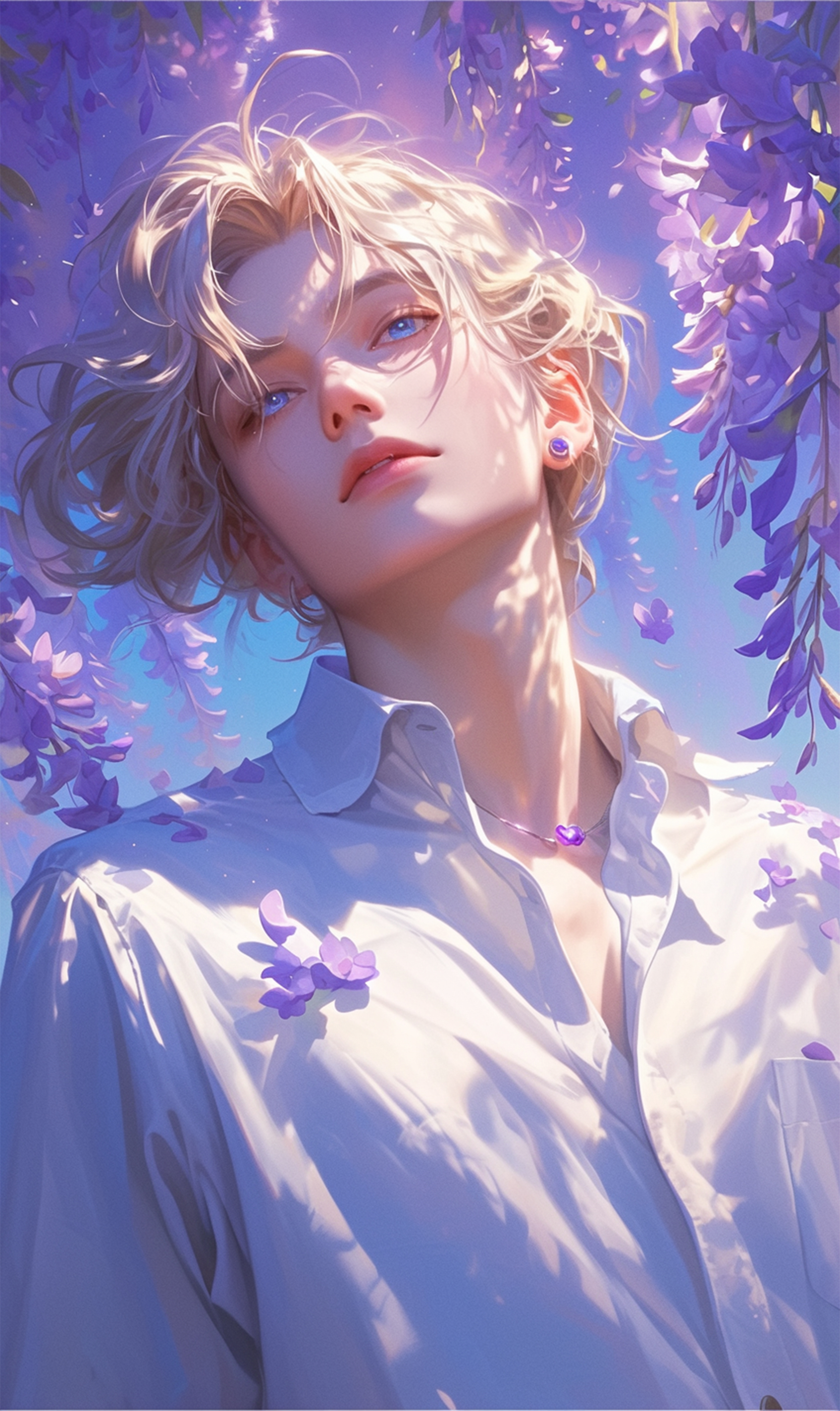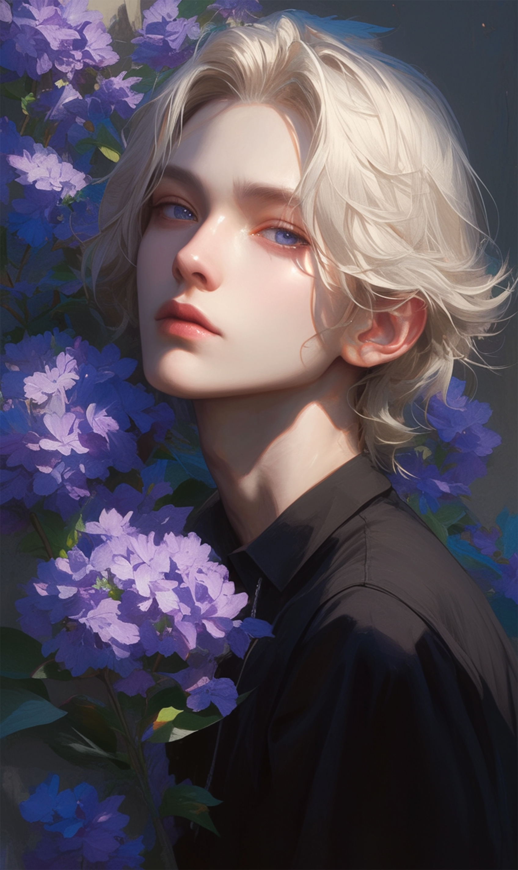 플레이브라는 한국 버추얼 남자 아이돌 그룹의 노아라는 친구의 비주얼 특징들을 포인트로 제작한 팬아트 배경화면입니다! 노아의 상징 중 보라색 하트가 있어서 보라색 꽃으로 대신해 장식된