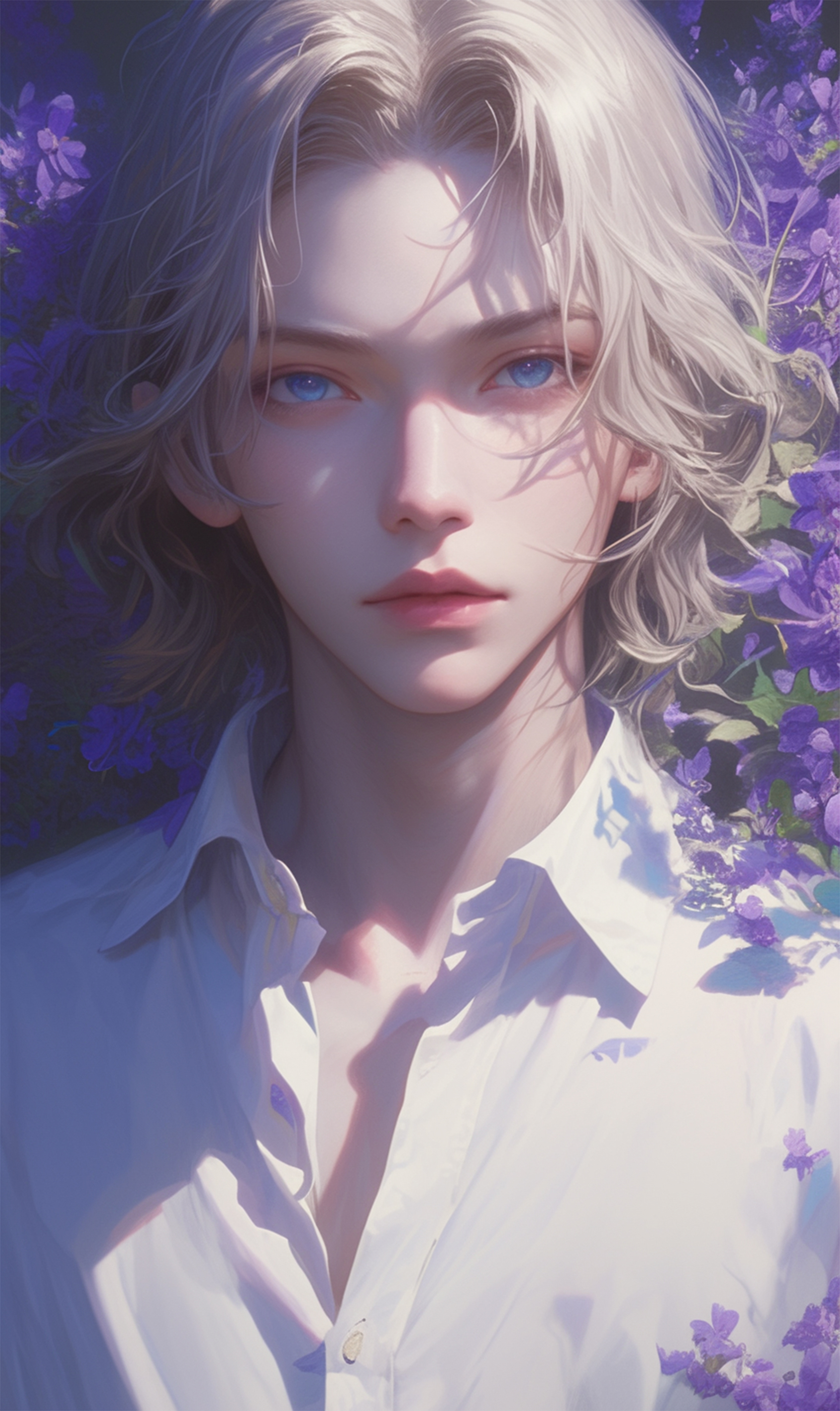 플레이브라는 한국 버추얼 남자 아이돌 그룹의 노아라는 친구의 비주얼 특징들을 포인트로 제작한 팬아트 배경화면입니다! 노아의 상징 중 보라색 하트가 있어서 보라색 꽃으로 대신해 장식된
