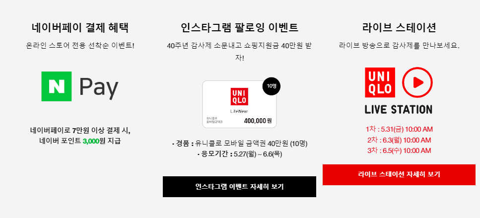 유니클로 인스타그램 팔로우하고 소문내기 이벤트에 참여하면, 유니클로 모바일 금액권 40만원을 받을 수 있어요. 총 10명에게 지급되며, 응모 기간은 5월 27일부터 6월 6일까지에요.