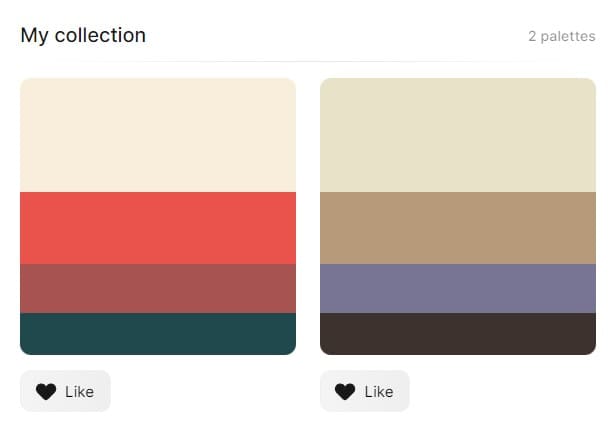 컬러헌트에서는 6자리 색상코드와 RGB 숫자 코드들을 확인할 수 있어요. 색 조합이 마음에 든다면 로그인 후 하트를 눌러 'Collection'에 저장할 수도 있어요. 해당 색조합을 이미지로 저장할 수도 있고, url 링크를 복사해서 공유할 수도 있죠.